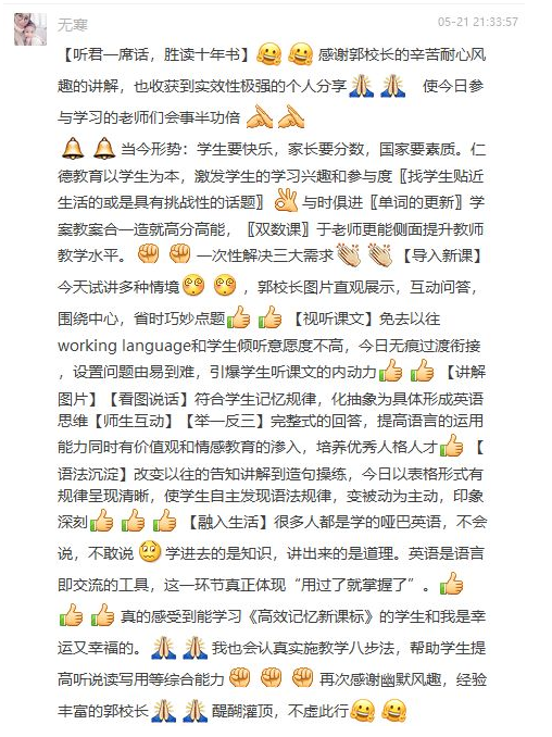 這次的(de)培訓内容十分(fēn)詳細,實操指導性非常強,讓參會(huì)的(de)老師(shī)們感覺到(dào)八步教學法銜接過度和(hé)竄詞是上(shàng)課無痕和(hé)學生接新的(de)關鍵。既要融入情境又(yòu)要兼顧文(wén)章(zhāng)句子,做到(dào)詞不離(lí)句,句不離(lí)文(wén)。最後,隻有(yǒu)熟悉新課改的(de)指導理(lǐ)念才能(néng)明(míng)确方向