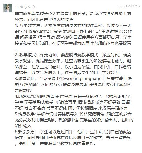 這次培訓的(de)重在在于如(rú)何落實翻轉課堂,翻轉課堂就是以學生爲主體,學生先要在家裏提前預習(xí)下一課的(de)課文(wén),詞彙,先達到(dào)知其然,然後老師(shī)應該利用(yòng)教學八步法帶領學生進入課堂中的(de)學習(xí)!課堂中加入師(shī)評,她平和(hé)自評!讓孩子能(néng)夠知其所以然!郭校(xiào)長進行(xíng)實操培訓!