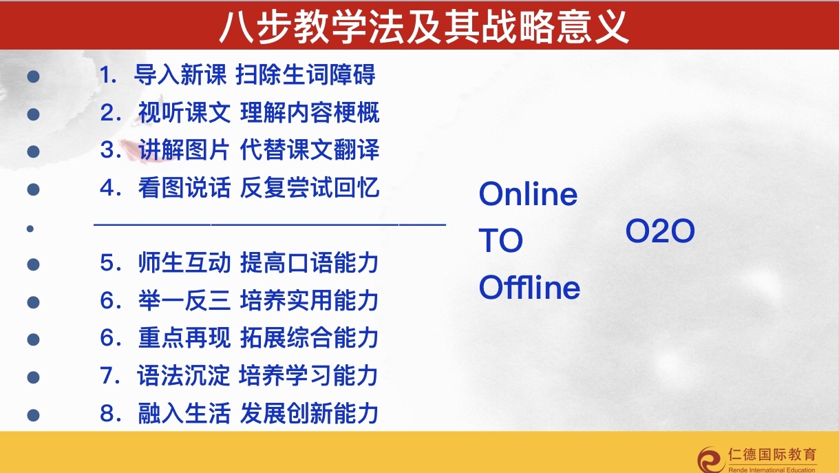 運用(yòng)八步教學法,對課程進行(xíng)完美(měi)的(de)銜接;通過方法的(de)講解,每個(gè)步驟對應課标的(de)模塊,對老師(shī)以後課堂創造情景教學做出良好的(de)指導,達到(dào)更好的(de)課堂效果;