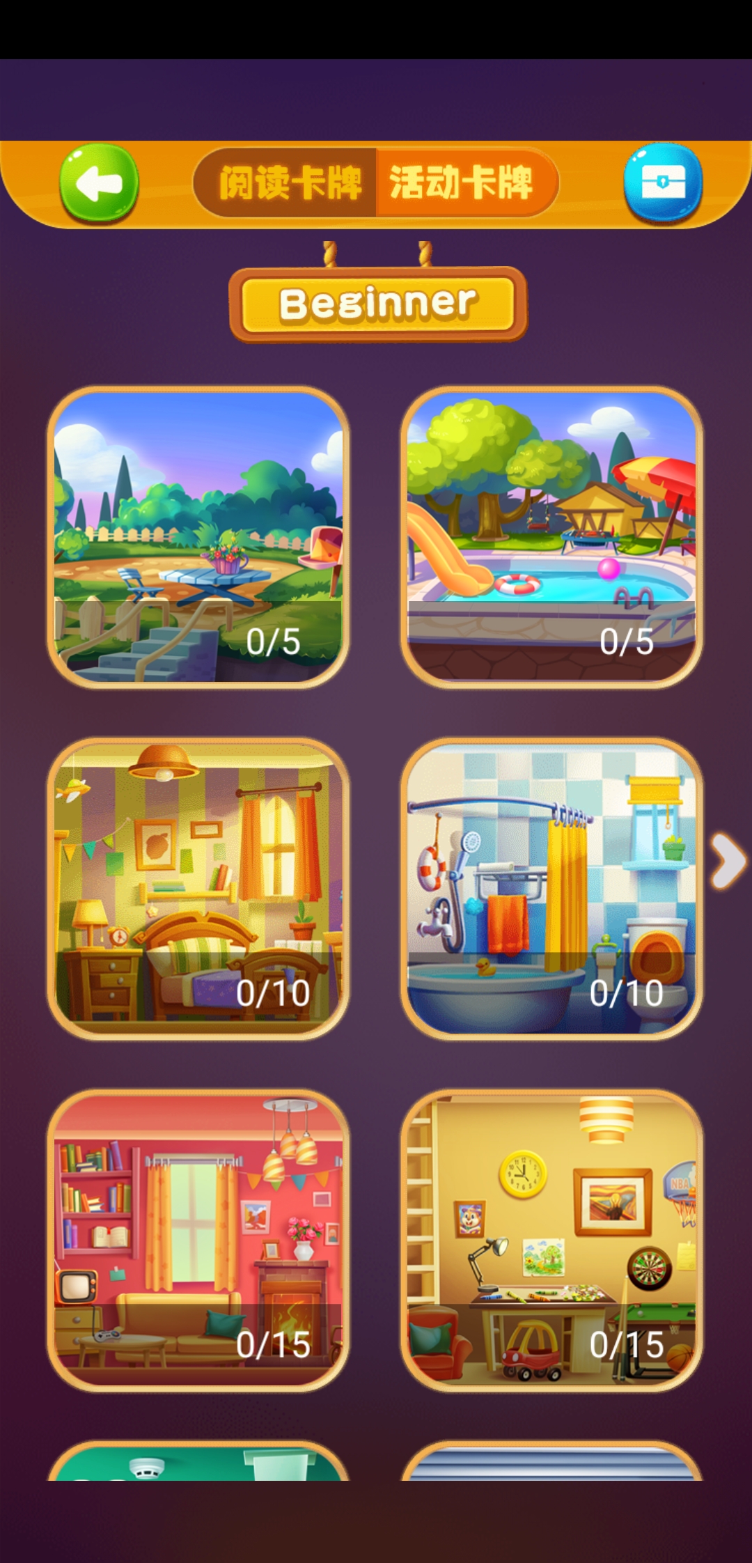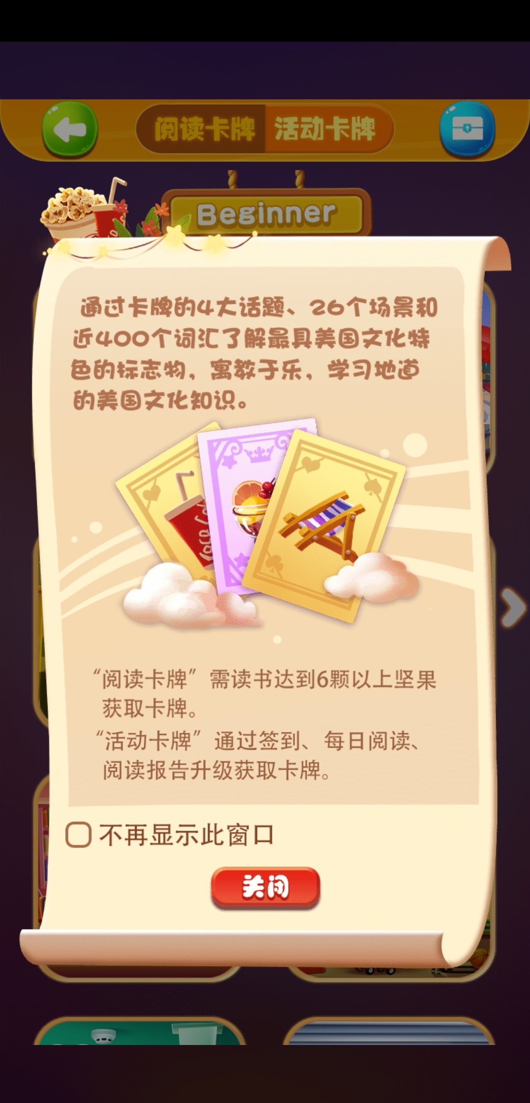卡牌:點擊“卡牌”進入卡牌界面,包括“閱讀(dú)卡牌”和(hé)“活動卡牌”兩大(dà)部分(fēn),每讀(dú)完一本書(shū)根據閱讀(dú)完成情況就有(yǒu)機會(huì)獲得一張卡牌,收集卡牌完成拼圖,可(kě)了解最具美(měi)國文(wén)化特征的(de)話(huà)題、場(chǎng)景及标志物(wù);