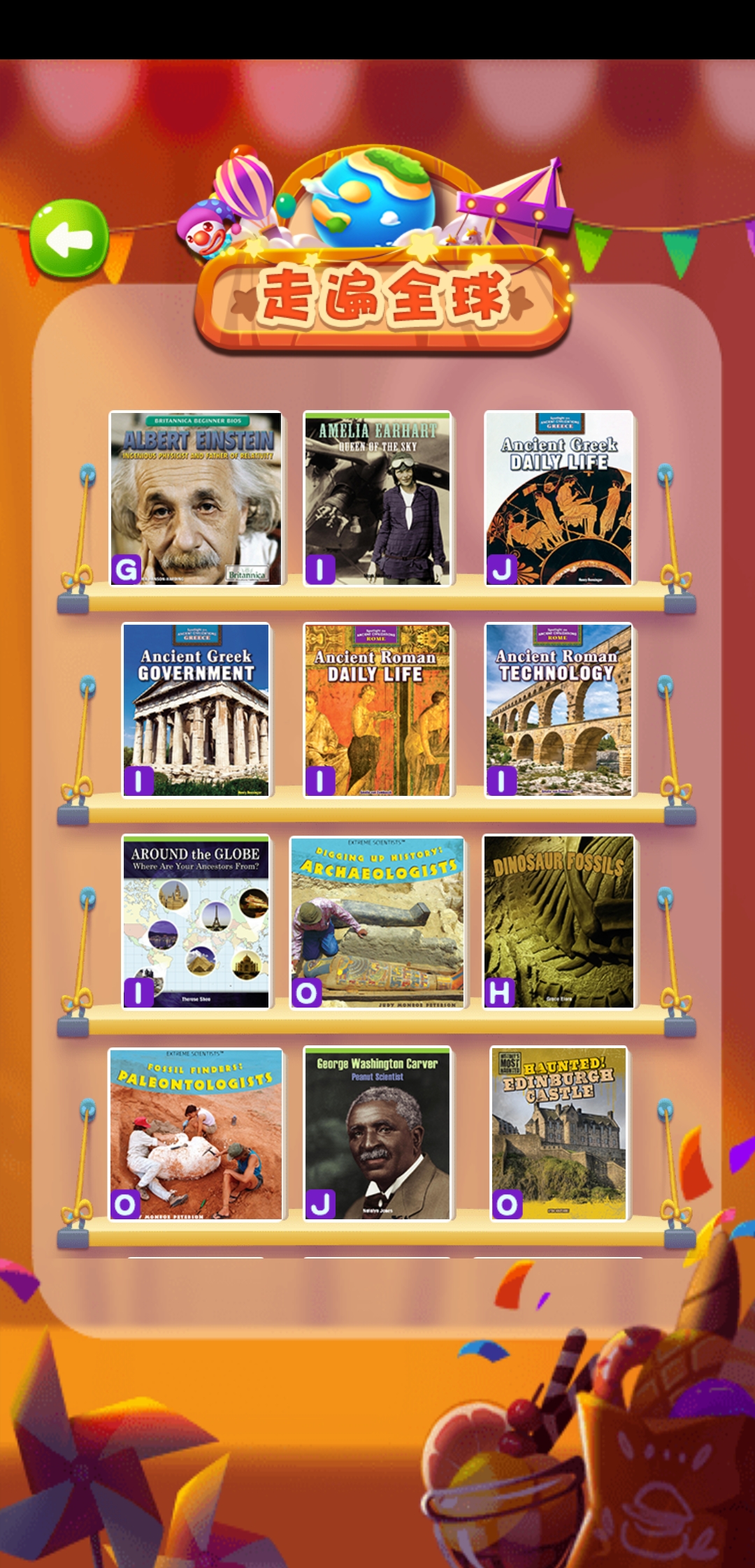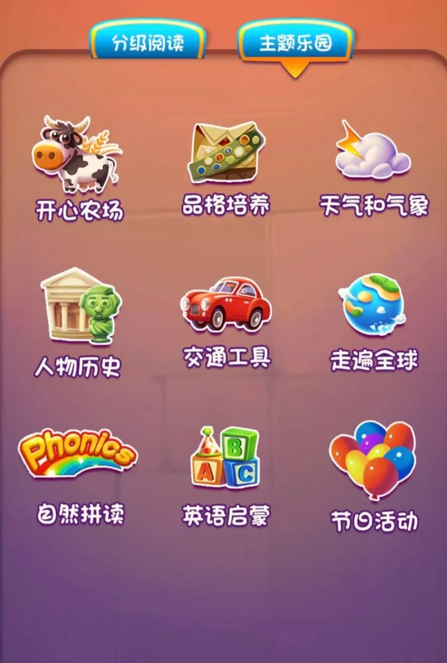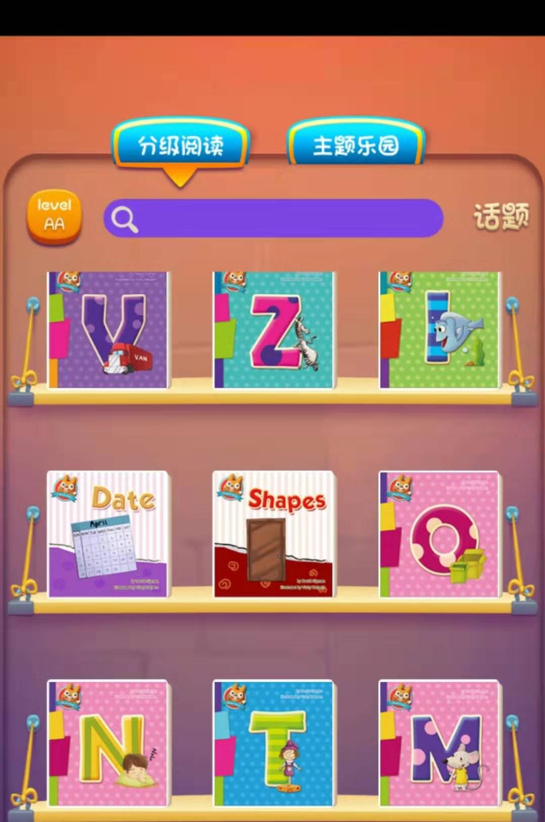 點擊底部菜單欄“圖書(shū)”進入圖書(shū)書(shū)架,分(fēn)爲“分(fēn)級閱讀(dú)”、“主題樂(yuè)園”