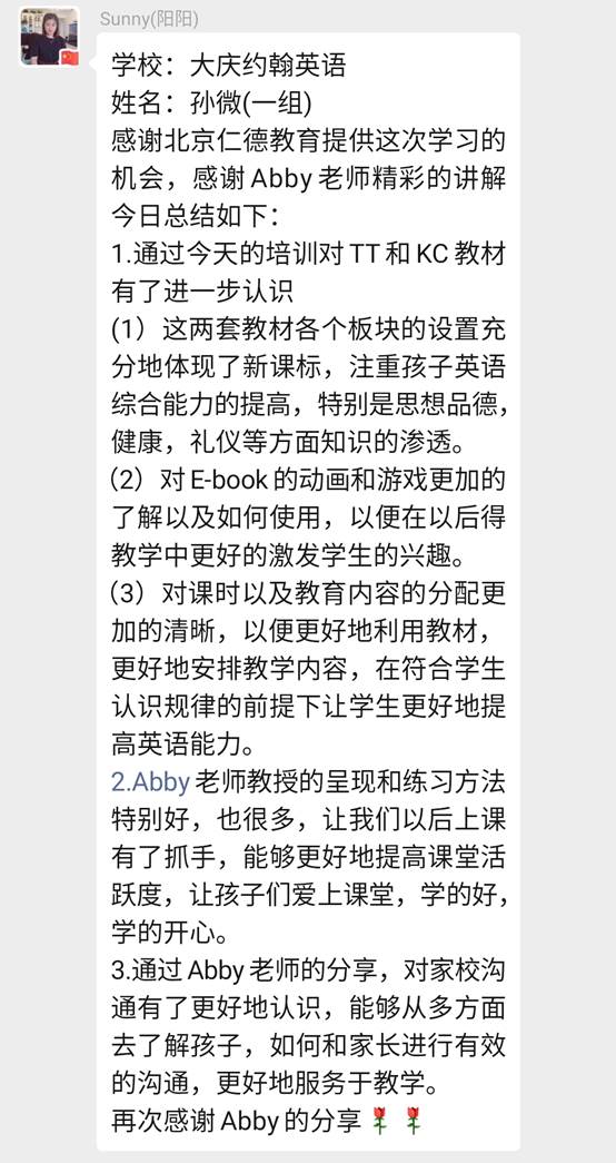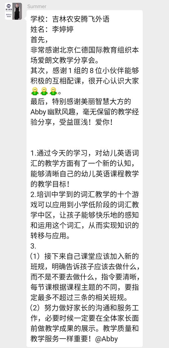 教師(shī)們紛紛表示,這次師(shī)訓,讓他(tā)們更加清晰幼兒英語的(de)教學目标、明(míng)确了家長溝通方向,明(míng)确了自己的(de)教學方向,也(yě)更加明(míng)白了教學質量與服務并重的(de)重要性。