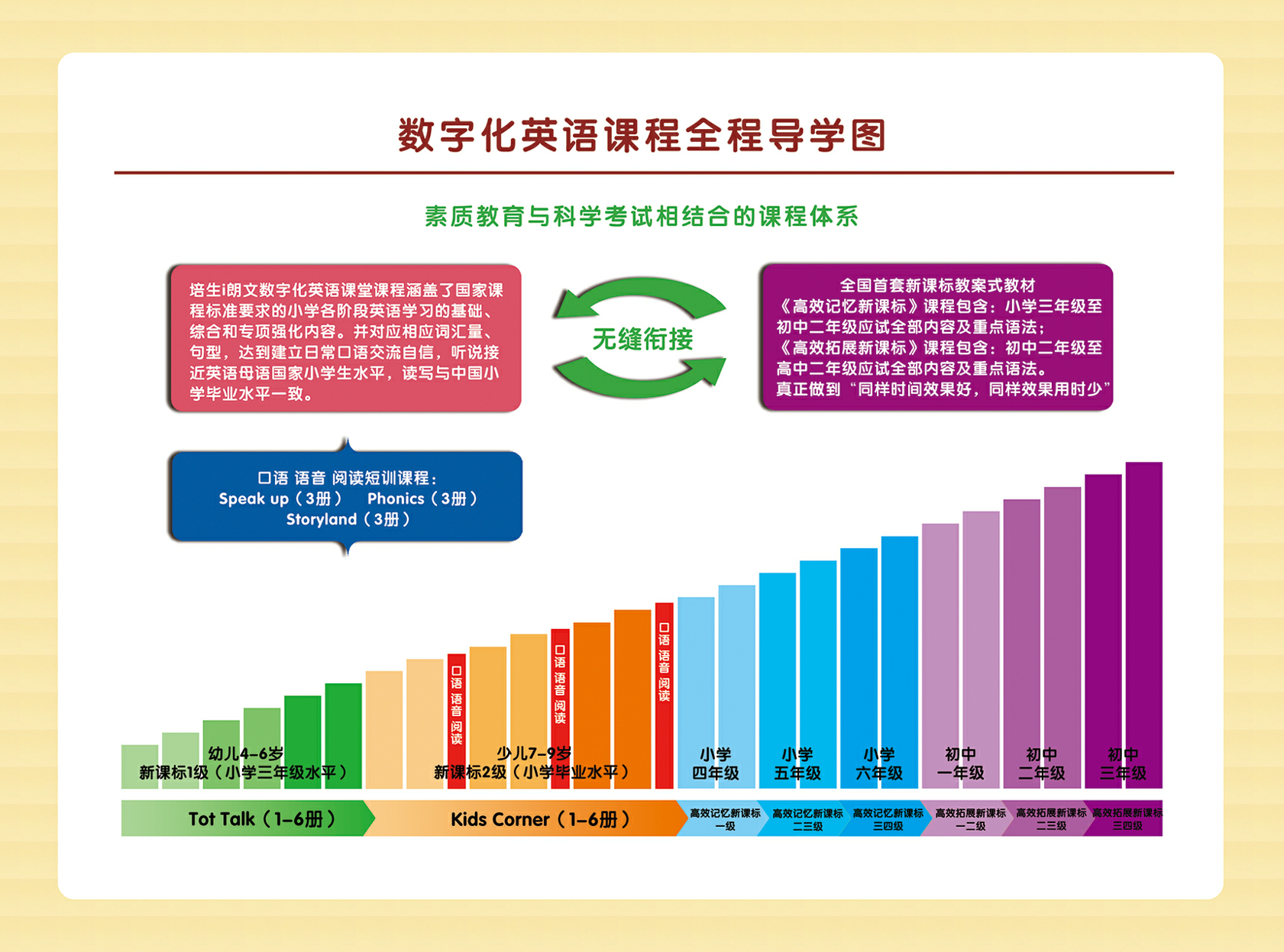 漸進式教學體系,通過大(dà)量接觸、理(lǐ)解運用(yòng)和(hé)拓展學習(xí),從根本上(shàng)解決孩子們英語學習(xí)的(de)量度、頻度和(hé)廣度的(de)問題,讓英語學習(xí)真正成爲母語學習(xí)。