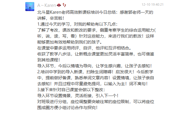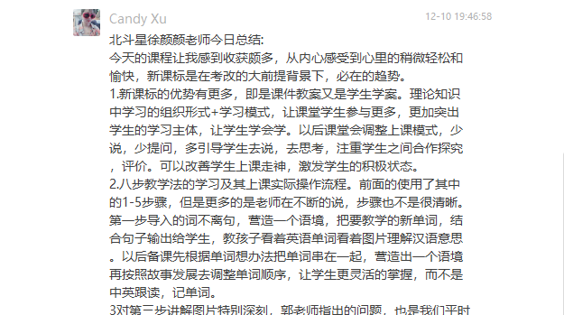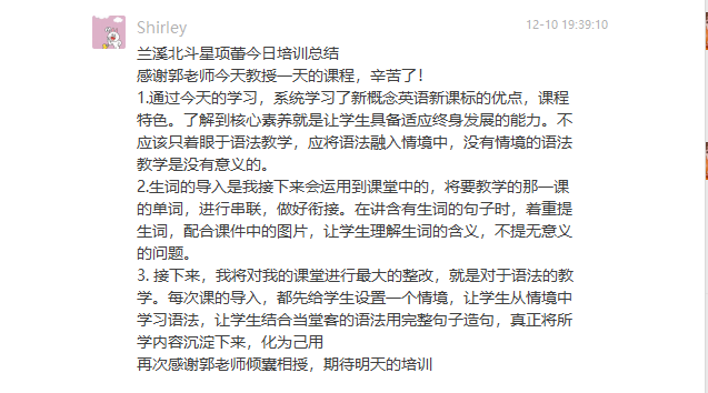 通過這次師(shī)訓會(huì)議,教師(shī)們紛紛表示在今後的(de)教學中,提前做好備課,熟悉單詞文(wén)章(zhāng)内容!設置情境,讓孩子親自去感知!并且過程中盡量避免提問,以輸入爲主,詞不離(lí)句。感觸頗深。