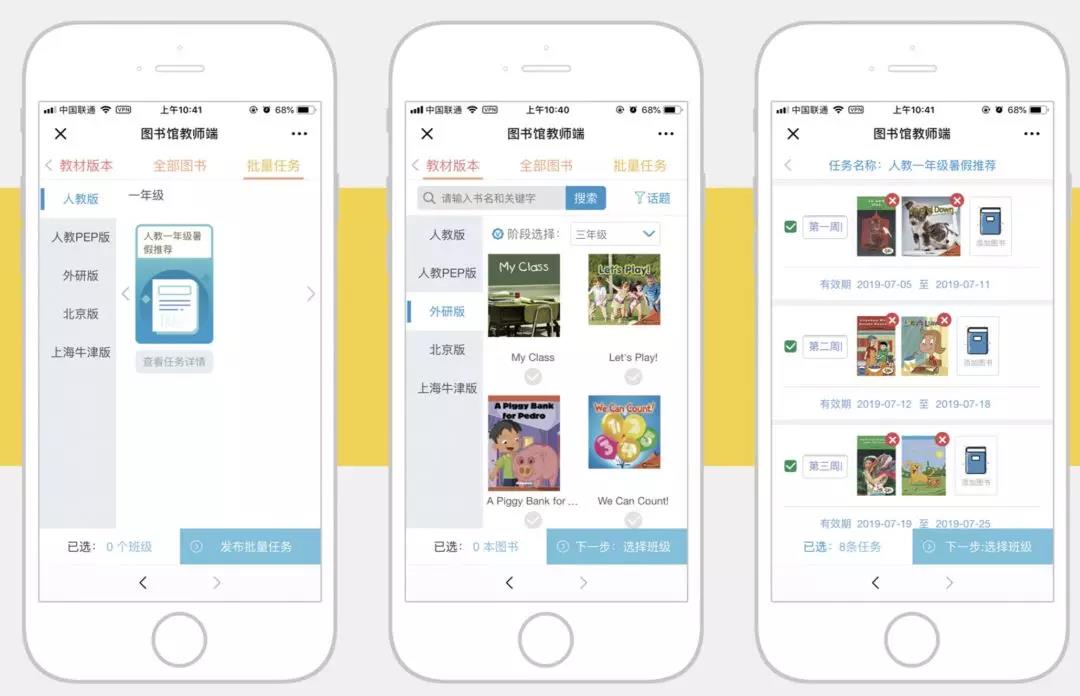 美(měi)式分(fēn)級閱讀(dú)教師(shī)端擁有(yǒu)班級管理(lǐ)功能(néng),機構老師(shī)可(kě)以自定義閱讀(dú)任務,也(yě)可(kě)以選擇名師(shī)推薦的(de)課外閱讀(dú)書(shū)單(包括人(rén)教、外研等多版本教材),一鍵發布一學期的(de)閱讀(dú)任務。