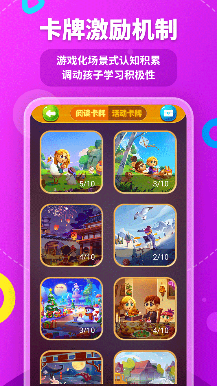 爲充分(fēn)調動孩子閱讀(dú)積極性,在閱讀(dú)過程中,還加入了豐富的(de)獎勵活動,比如(rú)認知卡牌,強化記憶各個(gè)生活主題;成就獎杯,讓孩子在學習(xí)中不斷收獲。