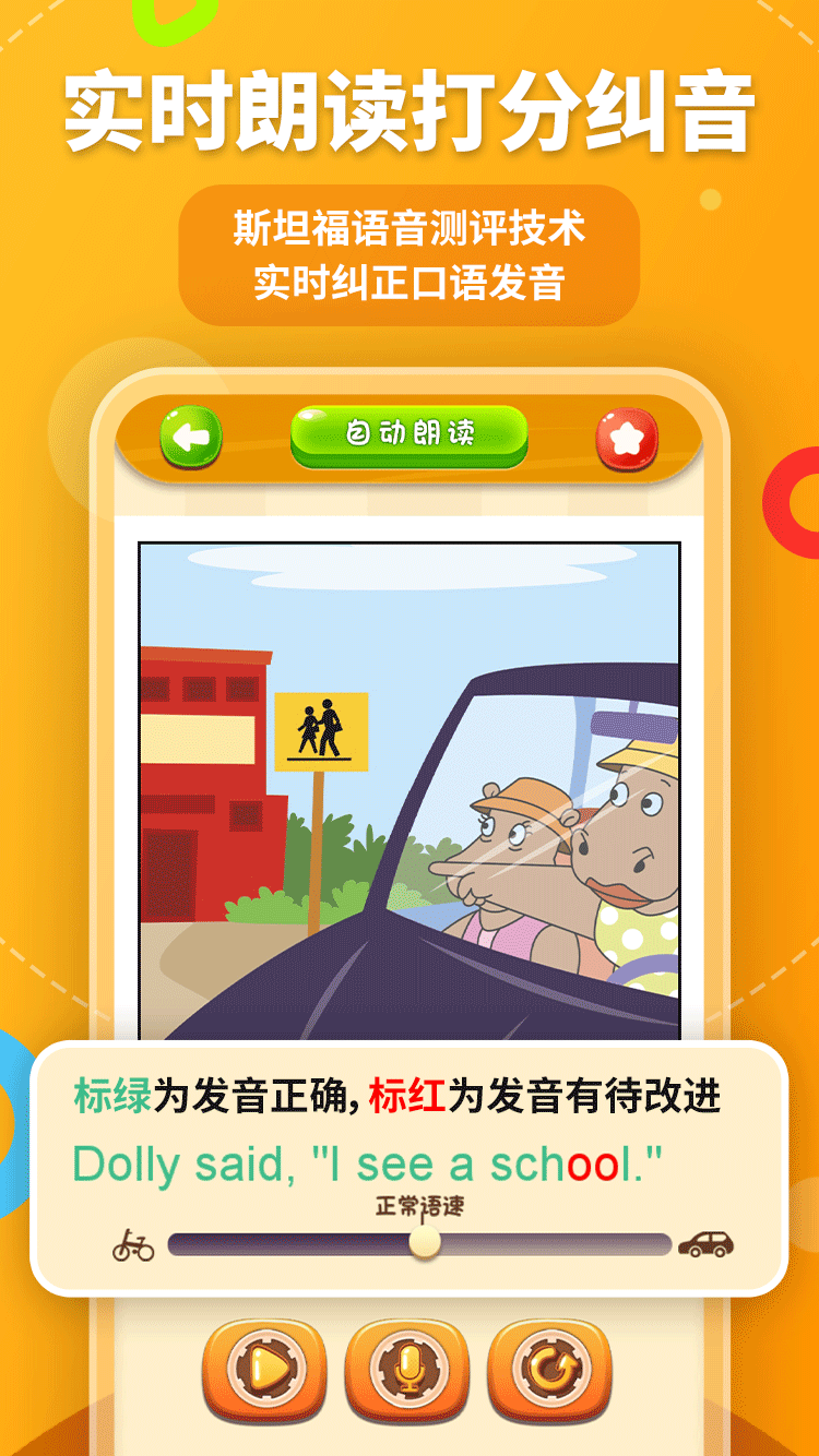 朗讀(dú)示範過程中,學生可(kě)以移動進度條,進行(xíng)語速調節,更清晰的(de)學習(xí)語音(yīn)、語調、重讀(dú)、停頓。