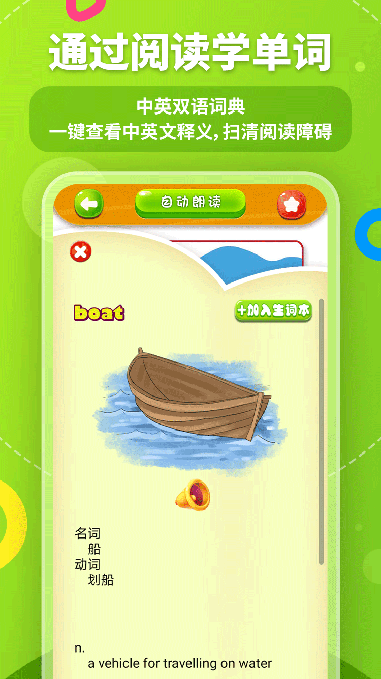 遇到(dào)不認識的(de)單詞,點擊該單詞即可(kě)打開(kāi)中英雙語詞典,還能(néng)加入生詞本中,用(yòng)單詞遊戲來強化記憶,還有(yǒu)貼心的(de)單詞報告,幫助孩子記錄學習(xí)過程。