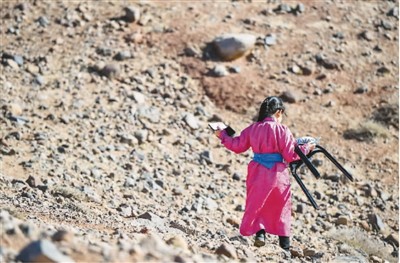 内蒙古自治區阿拉善左旗蒙古族學校(xiào)四年級學生策耿拿著(zhe)闆凳尋找避風處上(shàng)網課。新華社記者 連 振攝