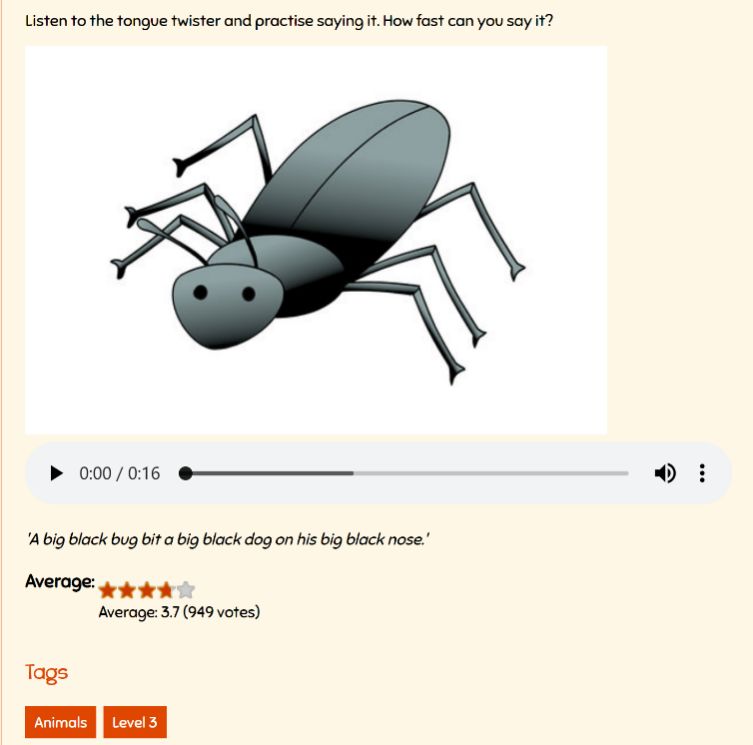 網站上(shàng)的(de)每一個(gè)繞口令都(dōu)有(yǒu)純正的(de)發音(yīn)音(yīn)頻,第一遍慢(màn)速,第二遍快速,并給予了難易程度的(de)星級評定,可(kě)供家長參考。