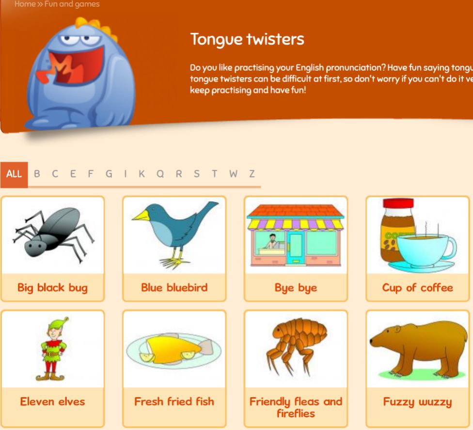 同樣,英文(wén)繞口令也(yě)是非常有(yǒu)趣的(de)。可(kě)是英文(wén)繞口令的(de)資源去哪裏找呢?給大(dà)家推薦一個(gè)非常寶藏的(de)資源網站,就是英國文(wén)化教育協會(huì)旗下的(de)兒童英語學習(xí)網:Learn English Kids,這個(gè)網站非常專業(yè),上(shàng)面不僅有(yǒu)繞口令、兒歌、繪本的(de)資源,還有(yǒu)在線遊戲、手工(gōng)活動的(de)資料,資源非常豐富。