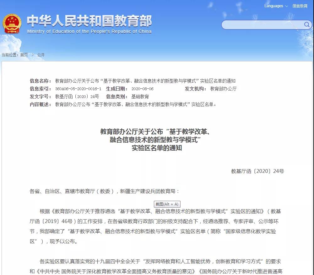 日前,教育部公布了“基于教學改革、融合信息技術(shù)的(de)新型教與學模式”實驗區名單(簡稱“國家級信息化教學實驗區”)。【完整通知及名單見文(wén)末】