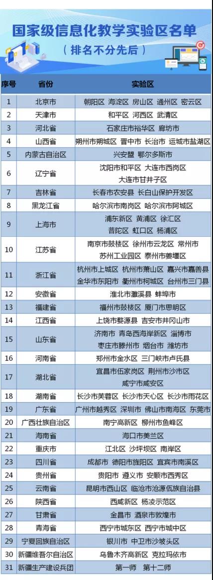 根據《教育部辦公廳關于推薦遴選“基于教學改革、融合信息技術(shù)的(de)新型教與學模式”實驗區的(de)通知》(教基廳函〔2019〕46号)的(de)工(gōng)作安排,在各省級教育行(xíng)政部門的(de)積極支持配合下,經遴選推薦、專家評審、公示等環節,我部确定了“基于教學改革、融合信息技術(shù)的(de)新型教與學模式”實驗區名單(簡稱“國家級信息化教學實驗區”),現予以公布。