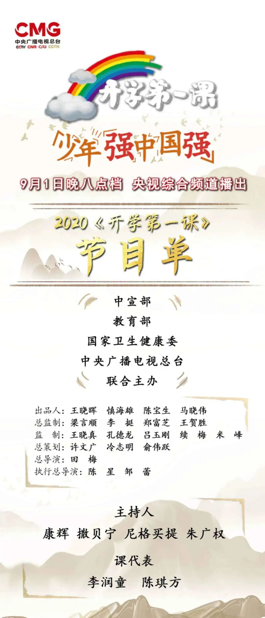 2020年9月(yuè)1日(周二)晚8點,由中宣部、教育部、國家衛健委、中央廣播電視總台聯合主辦的(de)《開(kāi)學第一課》将在央視綜合頻道(CCTV-1)播出。