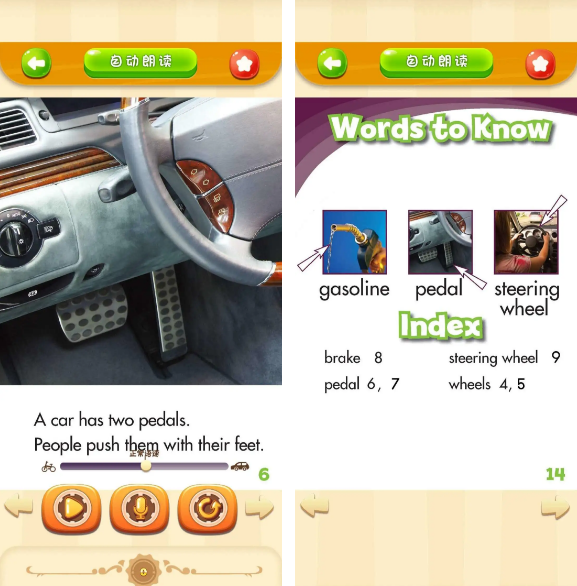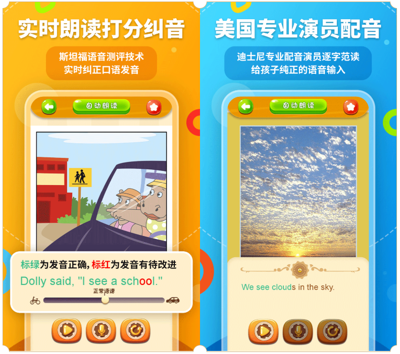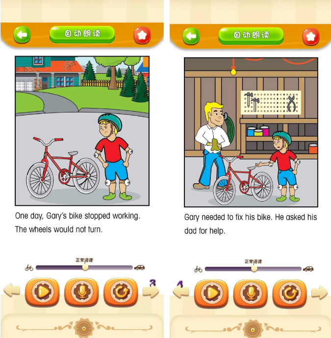 美(měi)式分(fēn)級閱讀(dú)中所有(yǒu)原版圖書(shū)資源均與SRI的(de)口語評估體系和(hé)打分(fēn)模型相(xiàng)結合,能(néng)夠精準地(dì)評估孩子英語口語的(de)地(dì)道程度,提供精準到(dào)音(yīn)素的(de)語音(yīn)測評反饋,幫助孩子練就純正發音(yīn)。朗讀(dú)示範過程中,學生可(kě)以移動進度條,進行(xíng)語速調節,更清晰的(de)學習(xí)語音(yīn)、語調、重讀(dú)、停頓。